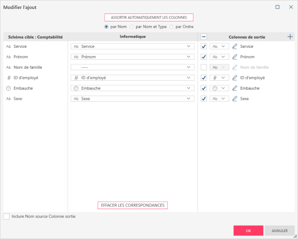 Par ordre : Cette option assortit toutes les colonnes des deux tables en fonction de leur ordre, quels que soient leur nom ou leur type. Le schéma adopté est celui de la première table sélectionnée.