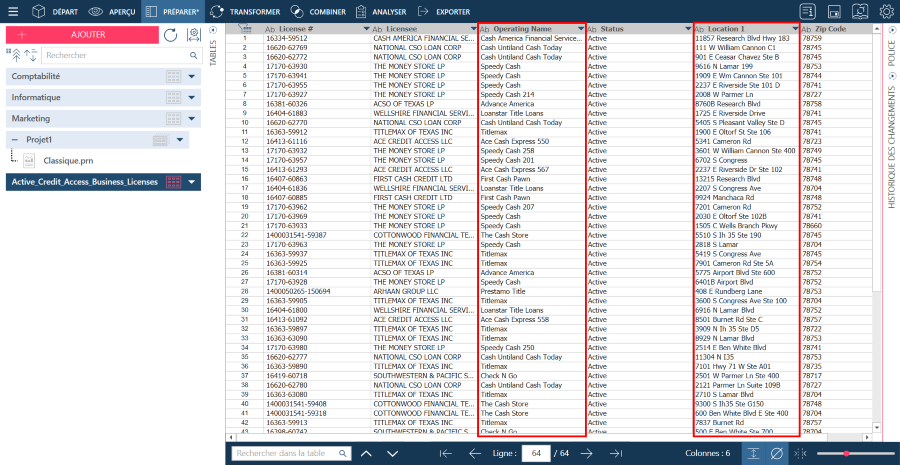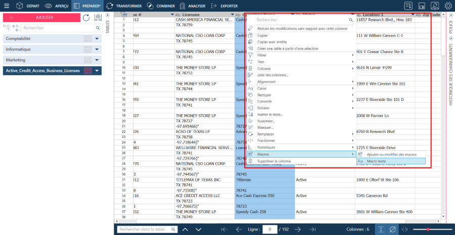 Sélectionnez une colonne de la table à laquelle une macro appropriée (numérique pour un champ numérique, etc.) doit être appliquée, puis cliquez sur le bouton Appliquer, à droite du type de macro, pour l’appliquer. La macro s’applique à toutes les colonnes répondant au même type de données que celle sélectionnée et l’aperçu des données en affiche le résultat.