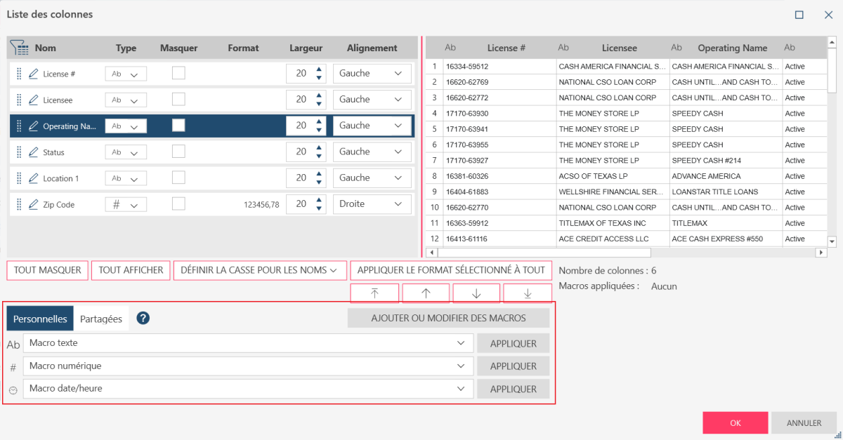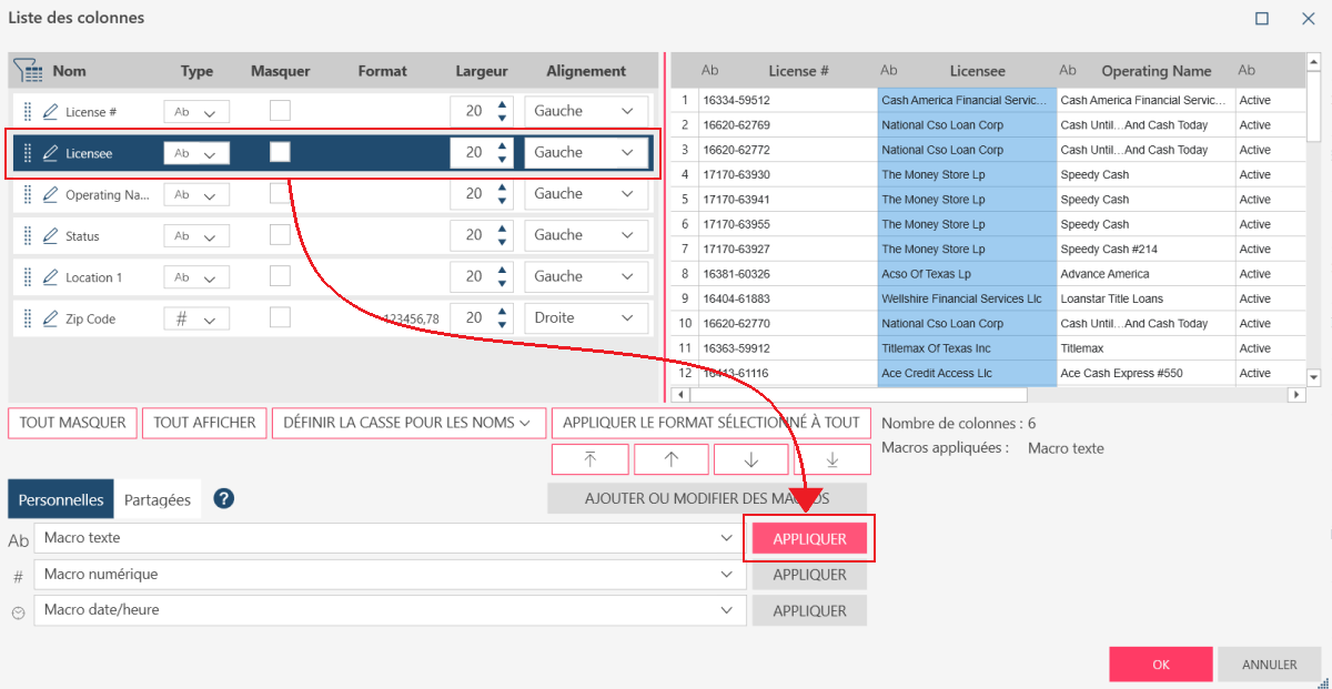 Les macros peuvent aussi être appliquées en passant par la boîte de dialogue Liste des colonnes. Ouvrez cette boîte depuis n’importe quelle colonne de votre table. Vos macros disponibles, personnelles ou partagées, s’affichent au bas de la boîte de dialogue.