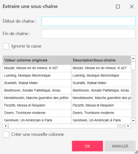 Lorsque vous exécutez cette opération, il vous est d’abord demandé de spécifier la chaîne à partir de laquelle commencer l’extraction, puis la chaîne de fin pour terminer l’extraction. Vous pouvez indiquer à l’application de ne pas tenir compte de la casse du texte en cochant la case Ignorer la casse.