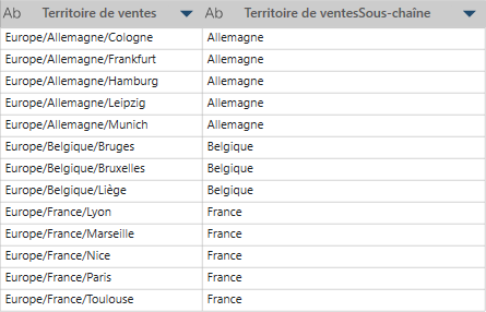 Dans cet exemple, la première colonne (Territoire de ventes) est la colonne d’origine. Nous commençons à extraire après la chaîne / et nous terminons sur la chaîne / pour obtenir la colonne Territoire de ventesSous-chaîne.