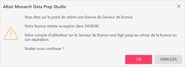 Si la licence de votre installation Monarch est activée via une instance du serveur de licence, vous aurez besoin d’une connexion Internet chaque fois que vous utiliserez l’application. Si, par exemple, vous partez en déplacement et n’êtes pas sûr d’avoir accès à Internet, vous pouvez retirer votre licence et utiliser Data Prep Studio hors ligne.