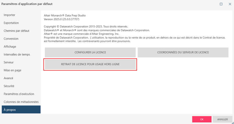 Dans Data Prep Studio, cliquez sur Paramètres > Paramètres par défaut de l’application > À propos > Retrait de licence pour usage hors ligne.