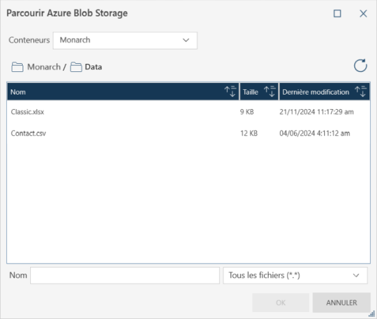 Un navigateur cloud standard vous permet d'importer des données à partir d'Azure Blob Storage et d'enregistrer/exporter des données vers cet espace.