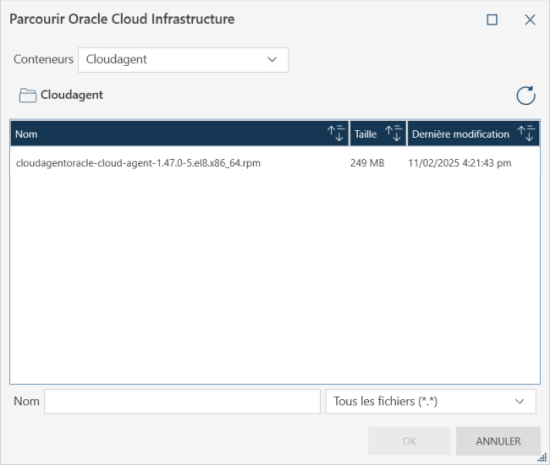Un navigateur cloud standard vous permet d'importer des données à partir d'Oracle Cloud Infrastructure et d'enregistrer/exporter des données vers cet espace.