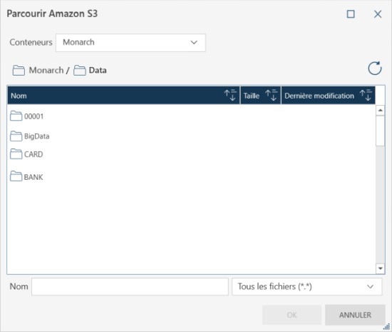 Un navigateur cloud standard vous permet d'importer des données à partir d'Amazon S3 et d'enregistrer/exporter des données vers cet espace.