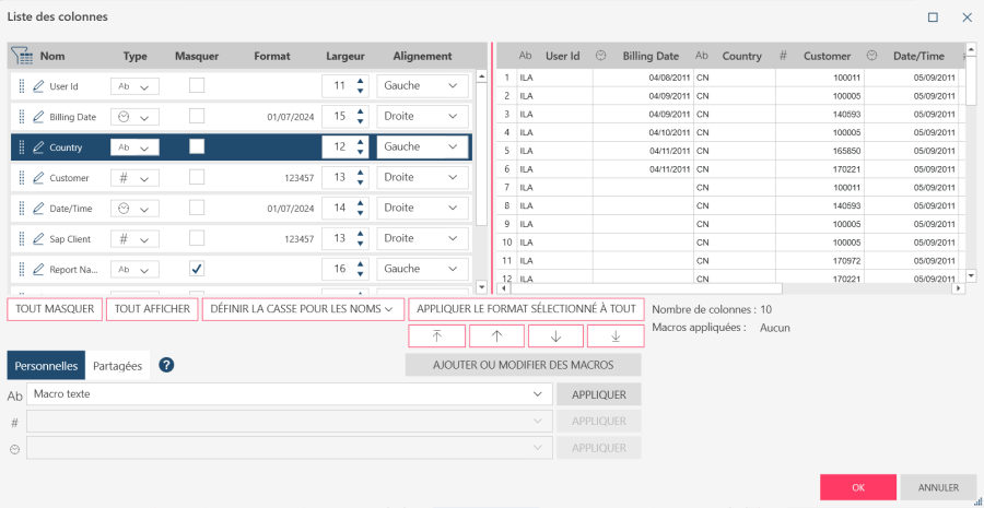 Afficher le nombre de colonnes comprises dans la table et les macros qui y sont appliquées