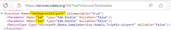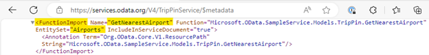 Dans le navigateur, allez à https://services.odata.org/V4/TripPinService/$metadata pour afficher le modèle de données d’entité du service OData. Recherchez « GetNearestAirport » sur la page et trouvez la valeur de jeu d’entités.