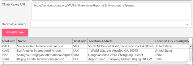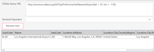 URL de la requête Odata : http://services.odata.org/V4/TripPinService/Airports?$inlinecount=allpages. URL de requête modifiée avec importation de fonction et paramètres : http://services.odata.org/V4/TripPinService/GetNearestAirport(lat = 33, lon = -118)