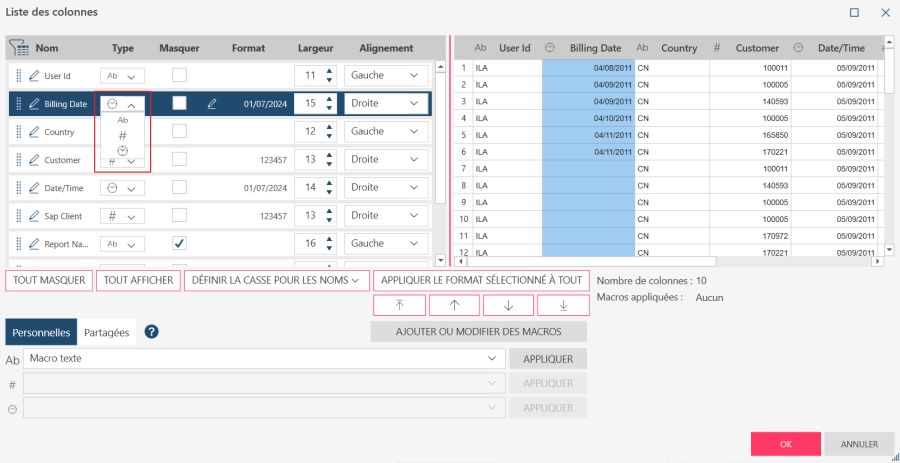 La boîte de dialogue « Liste des colonnes » offre un autre moyen de convertir les types de données dans Data Prep Studio.