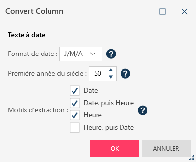 Première année du siècle : Utilisé pour convertir les années à deux chiffres en années à quatre chiffres. La valeur par défaut est 50. Motifs d’extraction : Les motifs recherchés lors de la conversion des valeurs de texte en valeurs de date et d’heure.