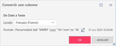 Locale : Permet de définir la langue de conversion des valeurs de date et d’heure en valeurs de texte. Format : Permet de modifier le format du texte. Cliquez sur l’icône Modifier pour afficher la boîte de dialogue Format et sélectionner le format de date souhaité pour le texte à afficher (Date courte, Date longue, Date courte/Heure, Date longue/Heure, Heure et Personnalisé).