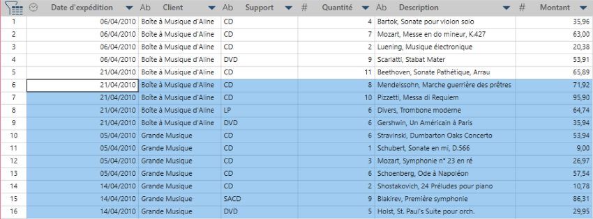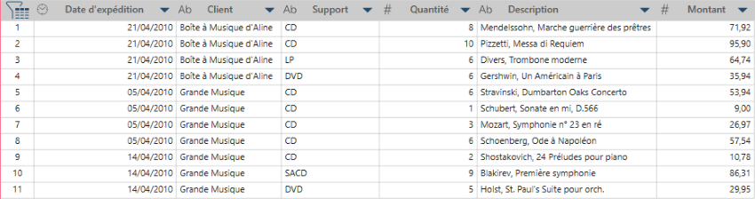 Avec la fonction Créer un tableau à partir d'une sélection, le nouveau tableau créé contient les colonnes et lignes suivantes :