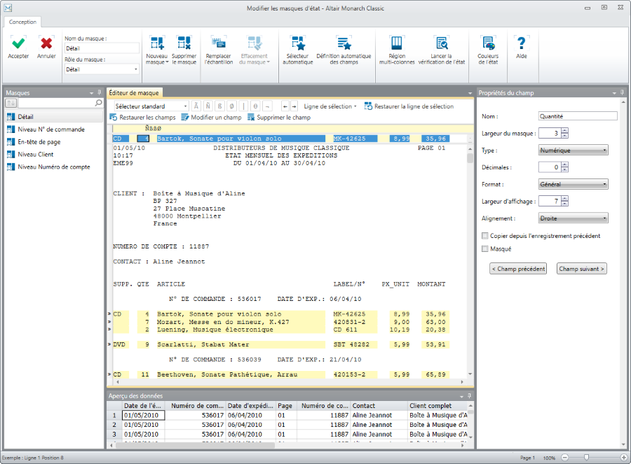 Beaucoup d’états sont triés à plusieurs niveaux. Ainsi, dans l’état illustré ci-dessous, les articles sont triés par client et par date d’expédition. Le client représente en l’occurrence le plus haut niveau de tri, et la date d’expédition, le niveau suivant. Les champs de transaction se trouvent au niveau de détail. Si votre fichier d’état comporte plusieurs niveaux de tri, vous devez définir un masque différent pour chaque niveau de données à extraire.