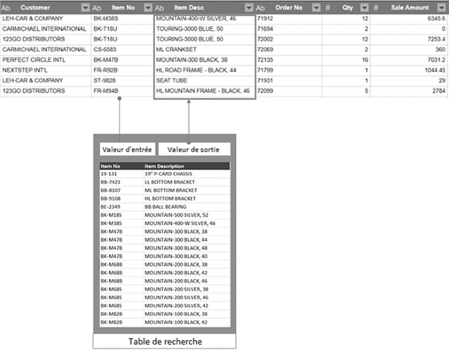 La commande centrale du champ de recherche est la table de recherche. Il s’agit d’une table dans laquelle vous définissez les paires valeur d’entrée/valeur de sortie désirées. Dans l’exemple ci-dessus, la description de l’élément correspond à un numéro de l’élément.