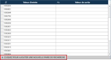 Si vous ne voulez pas importer de valeurs d’entrée ou si les valeurs d’entrée ne sont pas complètes, saisissez les paires de recherche manuellement. Pour ce faire, sélectionnez + Cliquez pour ajouter une nouvelle paire de recherche en bas de la table de recherche.