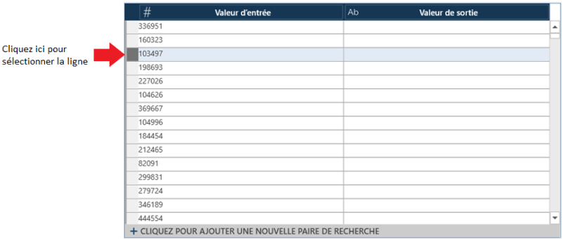 Utilisez les boutons suivants, qui se trouvent sous la table de recherche, pour supprimer des valeurs d’entrée ou de sortie: