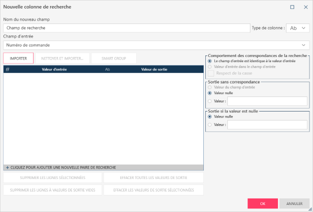 Un champ calculé reposant sur une recherche assure une « recherche de table » dans laquelle la valeur d’un champ d’entrée désigné est comparée à une table de recherche. Si une valeur d’entrée correspondante est identifiée dans la table de recherche, la sortie correspondante est utilisée. En l’absence de valeur correspondante, la sortie est soit identique à la valeur d’entrée, nulle ou une valeur par défaut. Les comparaisons peuvent être soumises au respect de la casse ou non.