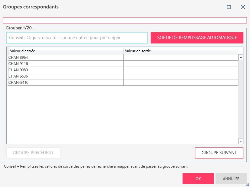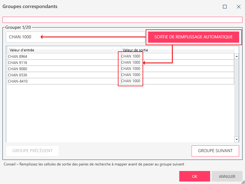 Sélectionnez l’une quelconque des valeurs en entrée comme valeur de mappage ou de sortie et cliquez sur Sortie remplissage automatique pour appliquer la sélection au groupe.