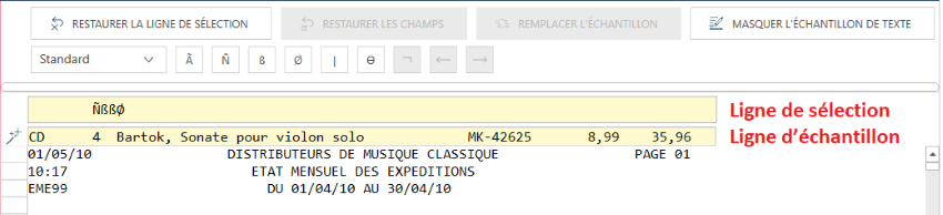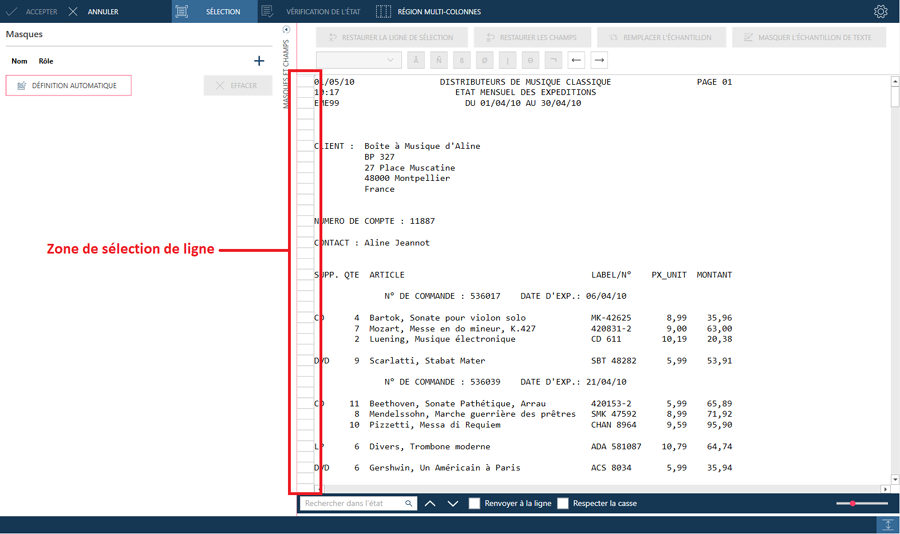 Dans certains états, les champs de détail sont présentés sur plusieurs lignes, par ex. un bloc de texte. Il peut aussi y avoir occasionnellement des caractéristiques uniques qui identifient la première ligne d’un bloc de texte. S’il est impossible d’utiliser cette première ligne, sélectionnez une autre ligne, dotée de caractéristiques uniques. Vous devez dans ce cas indiquer la ligne d’échantillon sur laquelle opérer la sélection via le champ Ligne de sélection.