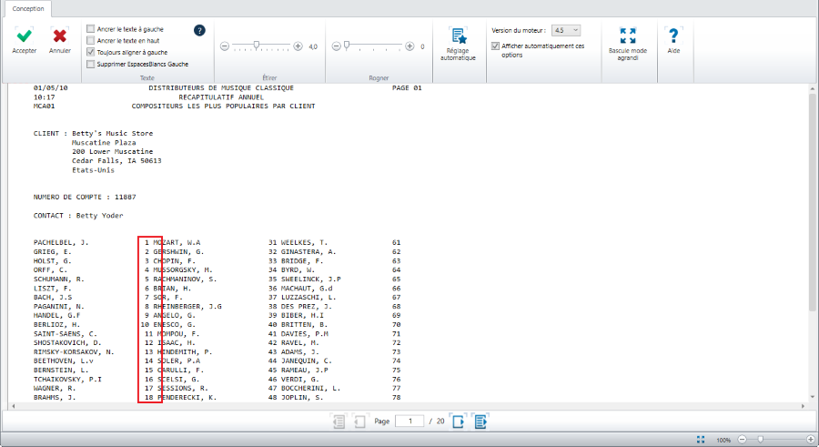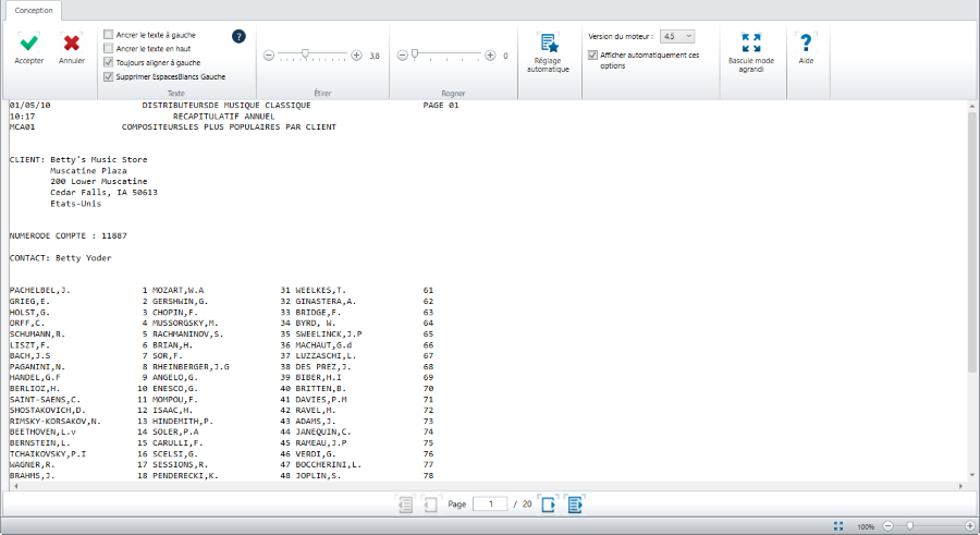 Ouvrez un état PDF dans la fenêtre Conception de l’état. Dans cet exemple, nous allons utiliser Compositeurs.pdf, généralement disponible dans C:\Users\Public\Documents\Altair Monarch\Reports.