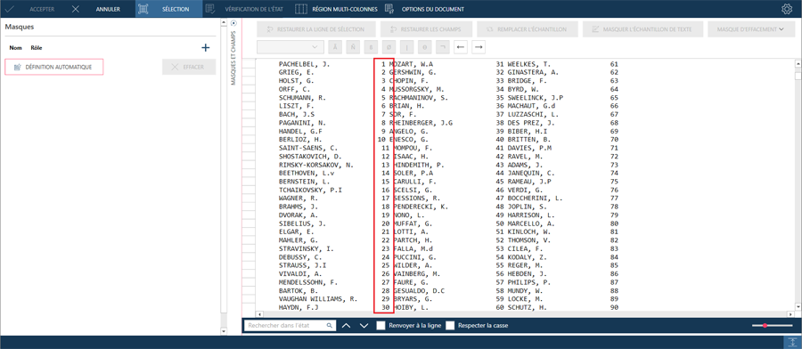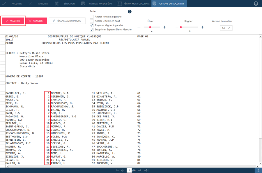 Par exemple, lorsque l'état PDF Composers.pdf, qui est généralement disponible dans C:\Users\Public\Documents\Altair Monarch\Reports, est ouvert dans Data Prep Studio et qu'un moteur PDF plus ancien est utilisé (par exemple, 4.3), la deuxième colonne semble décalée.