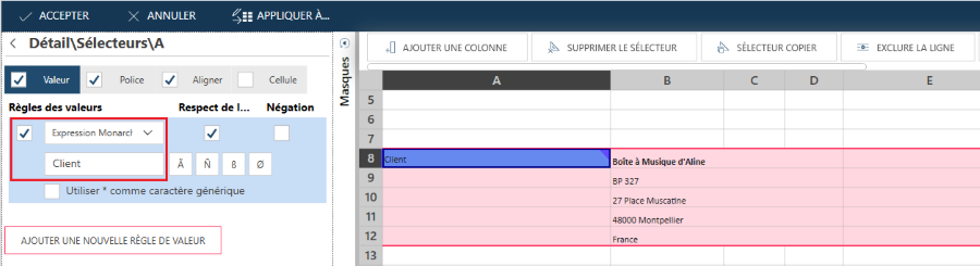 Vous pouvez utiliser n’importe quel sélecteur approprié. Dans ce cas, nous pouvons utiliser une expression Monarch et définir un sélecteur littéral. Utilisez « Client » :