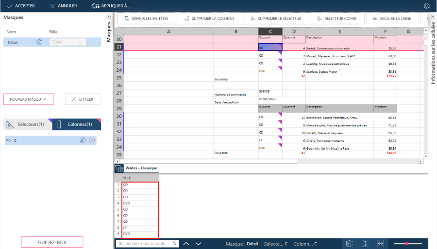 La Conception de feuille de calcul vous permet de sélectionner/capturer des colonnes comportant plusieurs lignes.