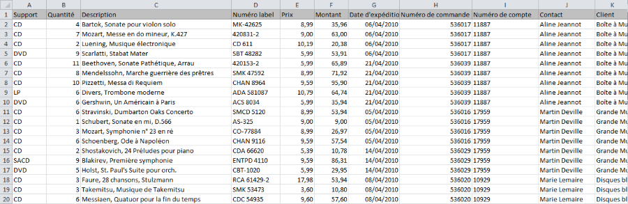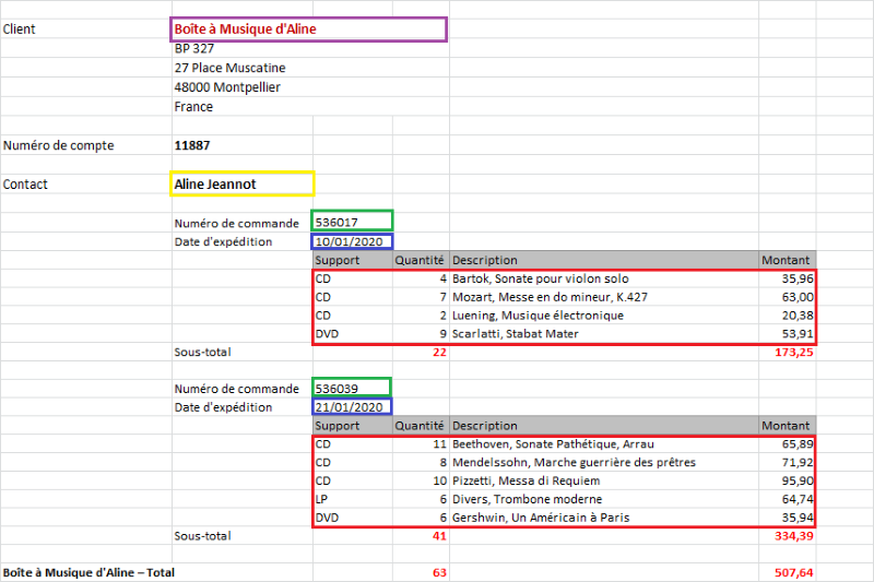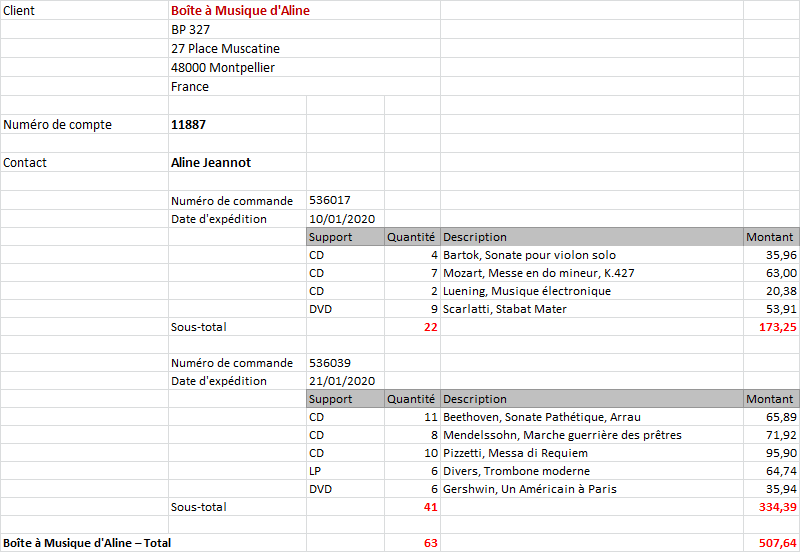 Le client représente le plus haut niveau de tri, suivi des coordonnées, du numéro de commande et de la date d’expédition. Les colonnes de transaction se trouvent au niveau de détail.