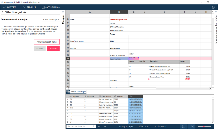 Si vous avez sélectionné des en-têtes, ils sont appliqués. Ils sont reflétés dans l’aperçu, ainsi que dans la liste des sélecteurs :
