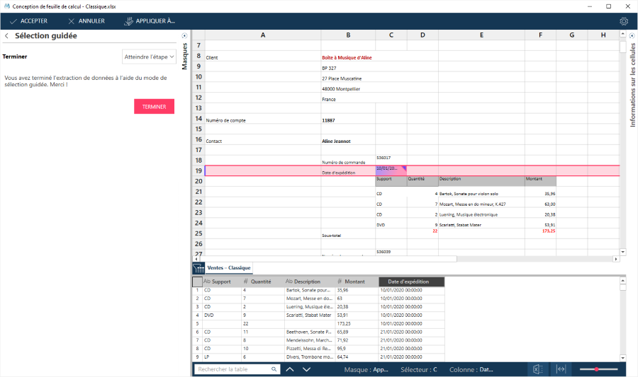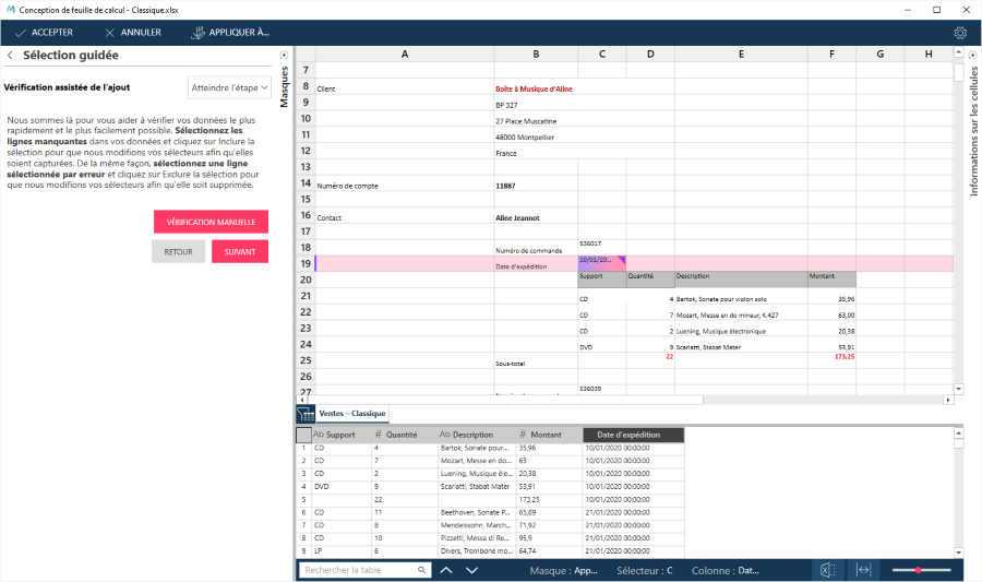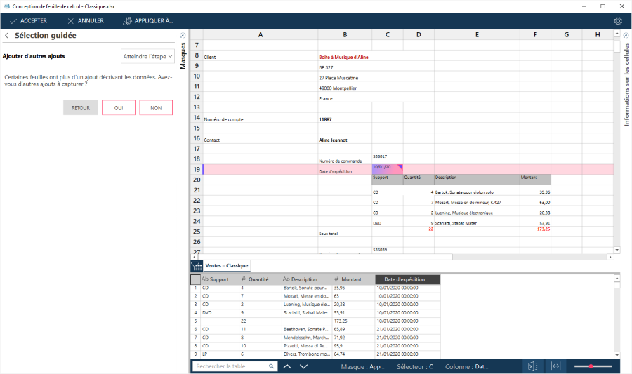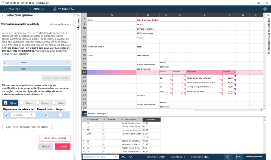 Des échantillons des données sélectionnées/capturées sont affichés dans l’aperçu (le panneau sous la feuille de calcul).