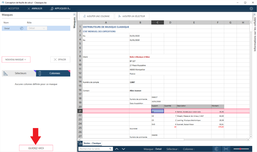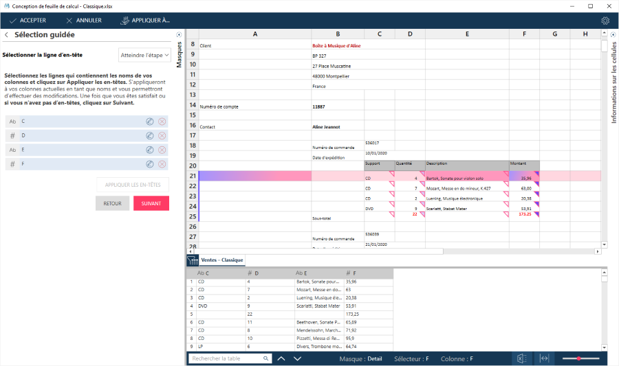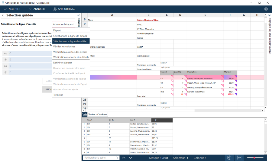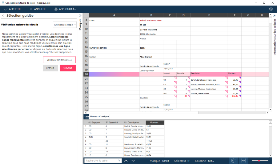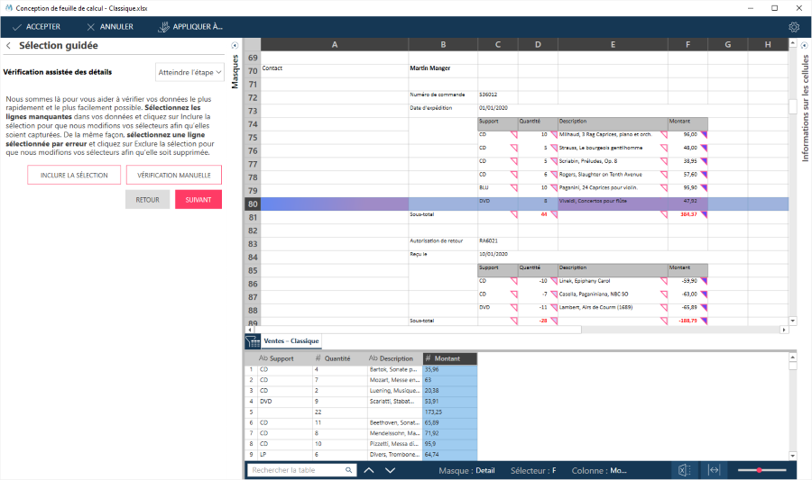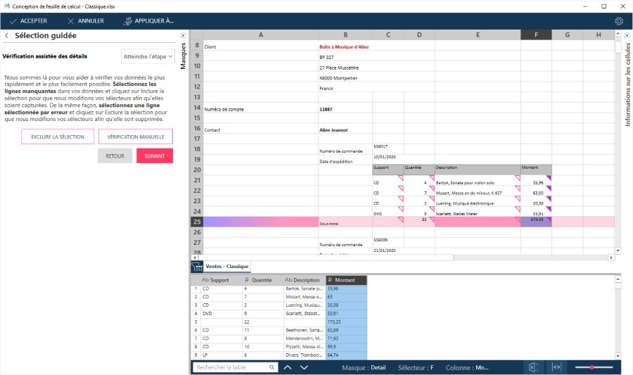 Avec cette méthode, vous sélectionnez ou désélectionnez les lignes de détail et l’assistant essaie d’ajuster les sélecteurs pour satisfaire vos critères de sélection.