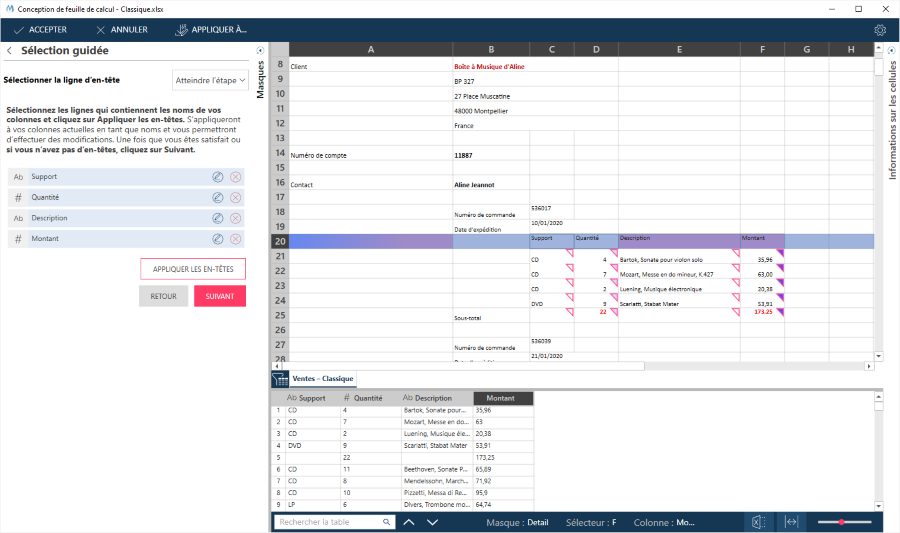 Cette étape devrait être facile : si vos détails ont des en-têtes, sélectionnez la ligne affichant les en-têtes, puis sélectionnez Appliquer les en-têtes. S’il n’y a pas d’en-têtes, sélectionnez Continuer.
