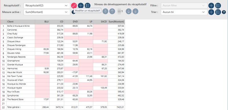 Vous pouvez modifier le nom d’un récapitulatif, sélectionner un autre filtre à appliquer au moment du calcul, ajouter ou supprimer des champs-clés, mesures ou champs d’article, ou modifier les propriétés des champs-clés, mesures ou champs d’article.
