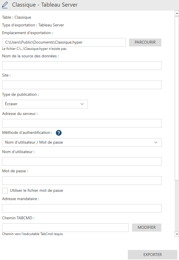 Attention : par défaut, le chemin vers l’utilitaire tabcmd ne peut pas être modifié à partir de la fenêtre d’exportation. Le chemin vers cet utilitaire peut être modifié dans la boîte de dialogue Paramètres par défaut de l’application.
