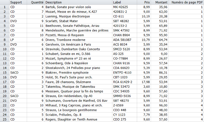 Dans le tableau, le résultat est une colonne PDF Page No (dernière colonne sur la droite dans l’exemple ci-dessous) affichant un numéro de page pour chaque ligne du tableau :