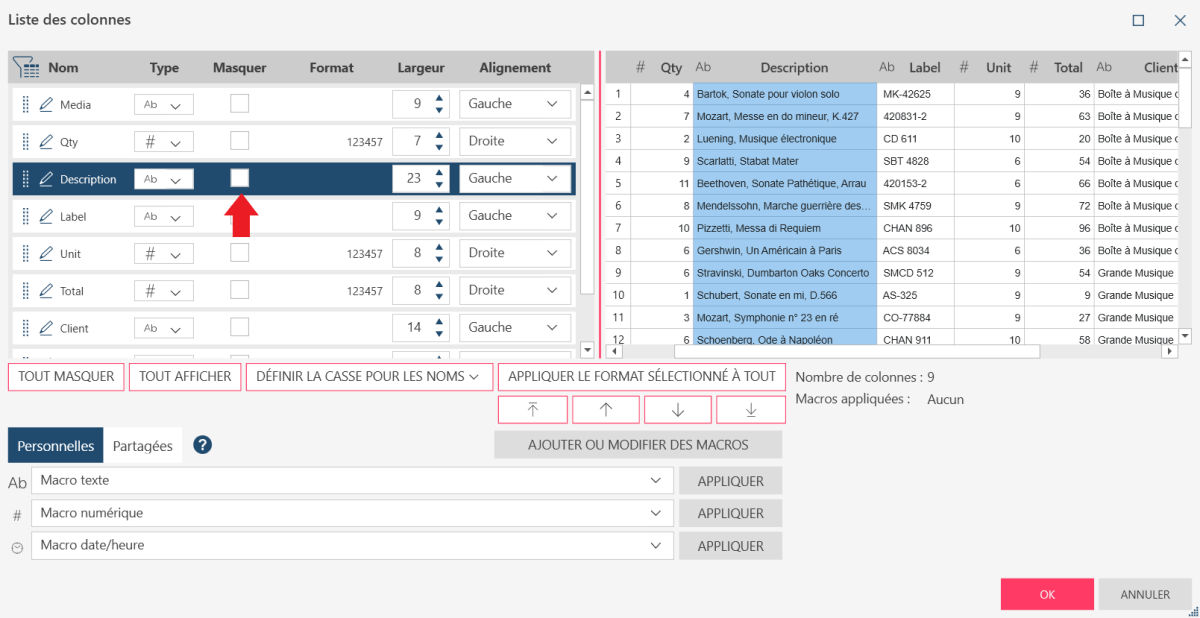 Cochez la case Masquer en regard de la colonne que vous voulez masquer.