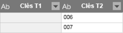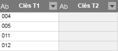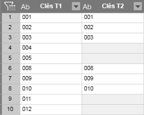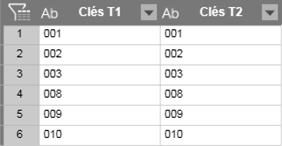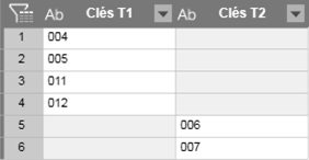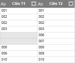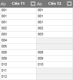 Si vous voulez effectuer une simple recherche, sélectionnez un type de jointure Recherche. Pour illustrer les types de jointure de recherche ci-dessous, considérez l’exemple suivant (seules les clés sont affichées pour plus de simplicité) :