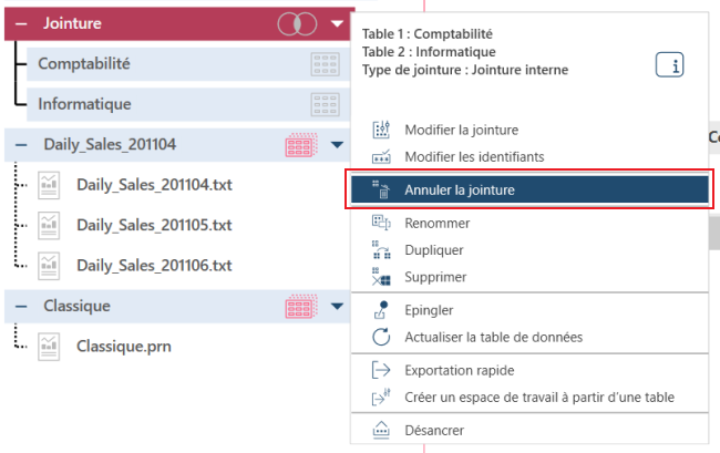 Si vous souhaitez modifier ou supprimer la jointure, sélectionnez l’option appropriée dans le menu déroulant en regard de la table de jointure.