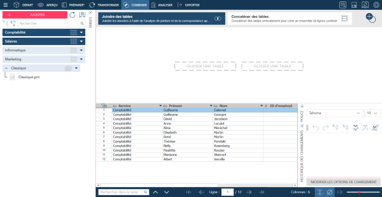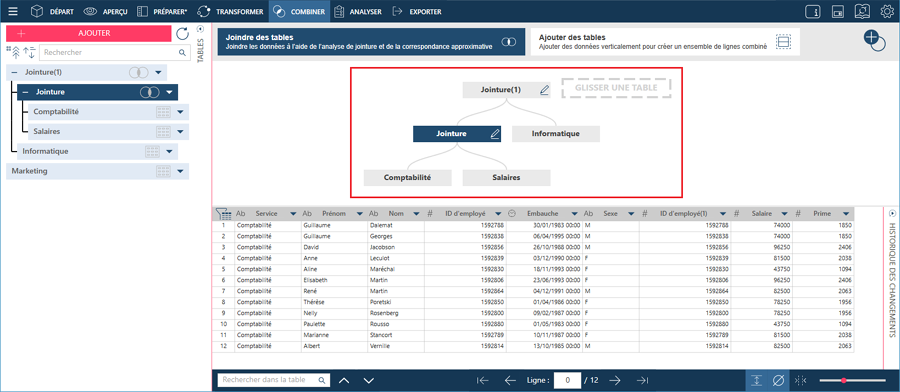 L’étape Combiner vous permet de créer des jointures à partir de deux tables en une seule session de jointure. Si vous souhaitez combiner les enregistrements de deux tables séparées, vous pouvez les joindre pour former une nouvelle table plus complète. Les jointures vous permettent de consolider vos données et d’offrir un affichage plus riche des informations qu’elles contiennent.