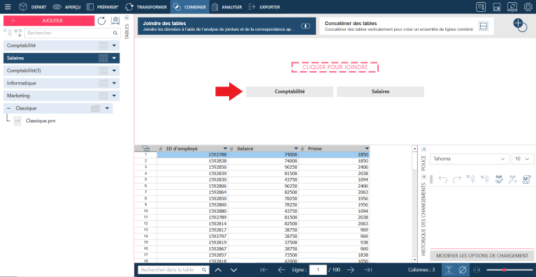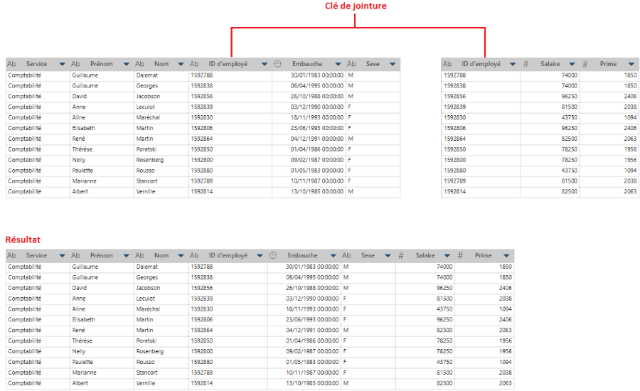 Dans l’exemple ci-dessus, on peut joindre la table Comptabilité et la table Salaires à l’aide de la clé de jointure ID d’employé.
