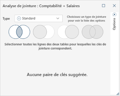 située en bas à droite de la boîte de dialogue.Remarque : Si vous souhaitez que Monarch Data Prep Studio analyse vos deux tables et vous recommande des clés de jointure, utilisez la fonction Analyse de jointure.