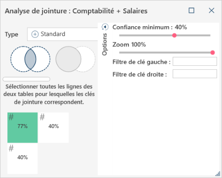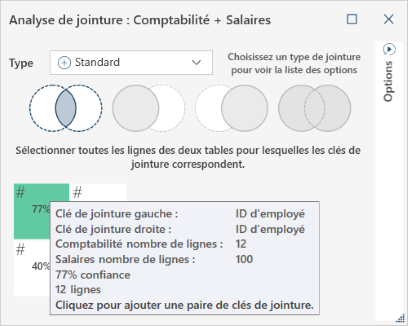 Dans cet exemple, la souris est placée sur une boîte qui indique 65 %. La fenêtre contextuelle vous dit que si vous utilisez ID d’employé de la table Comptabilité et ID d’employé de la table Salaires, vous obtiendrez une correspondance de 65 %.