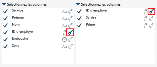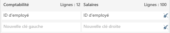 Pour sélectionner les clés de jointure, sélectionnez l'icône de clé désirée dans la table de gauche et l'icône de clé associée à la colonne correspondante dans la table de droite.