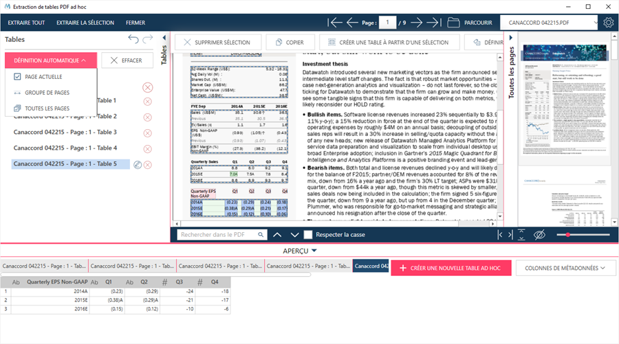 La définition automatique offre une méthode rapide et simple pour la capture de tables dans le fichier PDF.