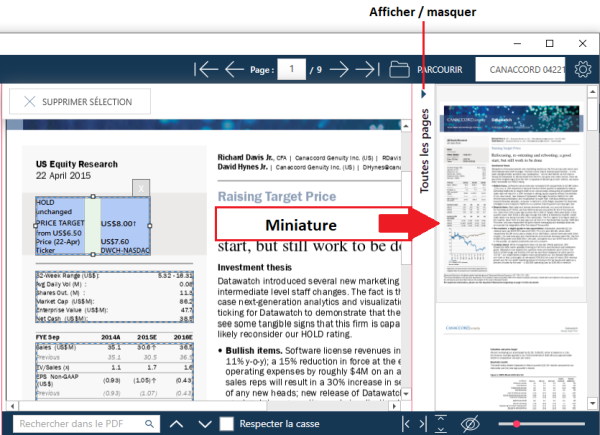 Les vignettes (pages du document en version réduite) permettent de rechercher une page particulière.