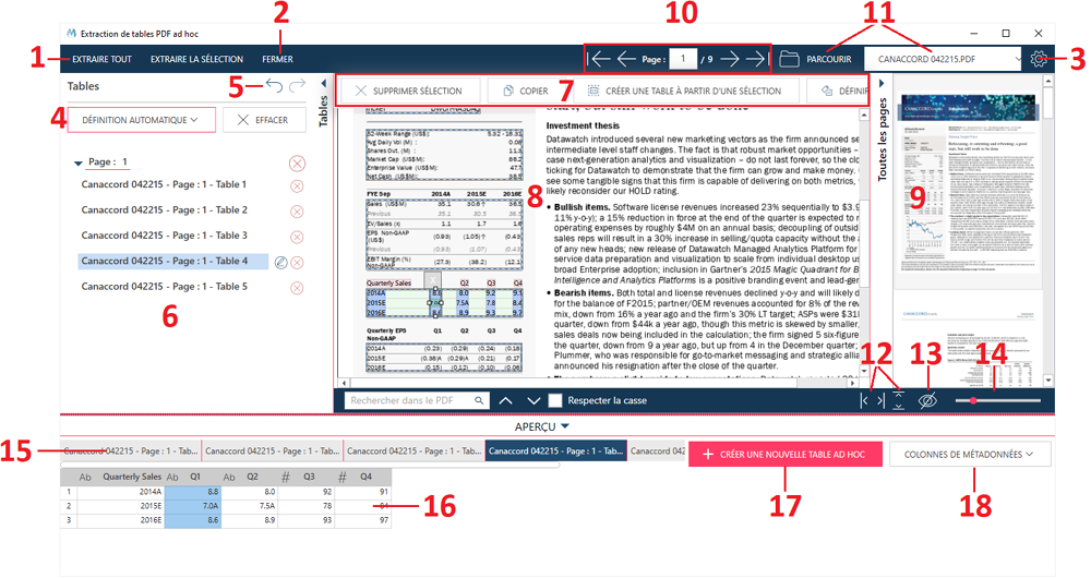 Aperçu de page Affiche la page actuelle d'un document. Servez-vous de cette fenêtre pour afficher une page et ses tables. Les vignettes de page (élément n° 9) et les navigateurs de page (élément n° 10) permettent d'accéder à une page différente. Reportez-vous à la rubrique Ouvrir et exploiter votre document pour plus de détails. |