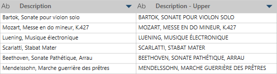 Dans cet exemple, Description est la colonne d'origine et Description – Upper contient les nouvelles valeurs ; tous les mots de la description sont convertis en majuscules :