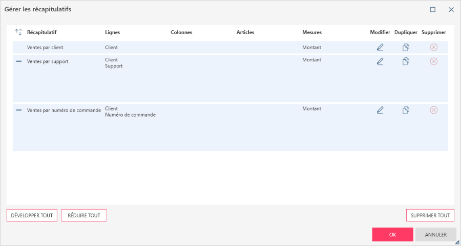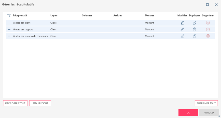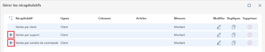 Après leur création, vous pouvez consulter les propriétés de vos récapitulatifs, notamment les lignes, les colonnes et les mesures qu’ils contiennent, les modifier, les dupliquer et les supprimer. Toutes ces actions sont disponibles dans la boîte de dialogue Gérer les récapitulatifs.