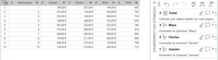 Dans l’exemple suivant, la table A inclut un enregistrement des ventes quotidiennes pour le premier trimestre de l’année. Dans cette table, les colonnes utilisées s’appellent Sales/Day (ventes quotidiennes), January (janvier), February (février), March (mars) et April (avril). La colonne Total Sales (ventes totales) est obtenue en additionnant les ventes quotidiennes pour ces mois.